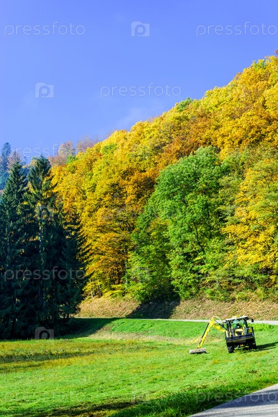 Машина для резки травы на сельской дороге