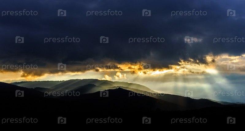 Солнечные лучи пронзают облака над горами