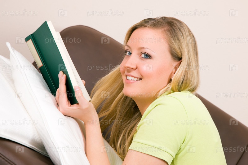 Девушка читает книгу лежа на диване