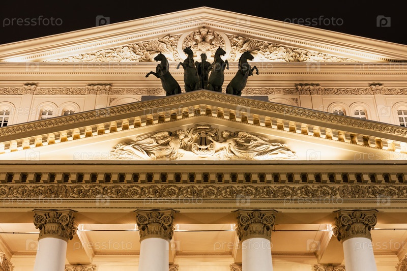 Фронтон большого театра в Москве в ночь