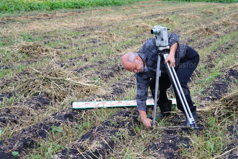 Пожилой мужчина с теодолитом измеряет расстояние в поле