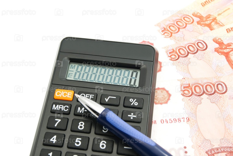 Деньги, черный калькулятор и ручка