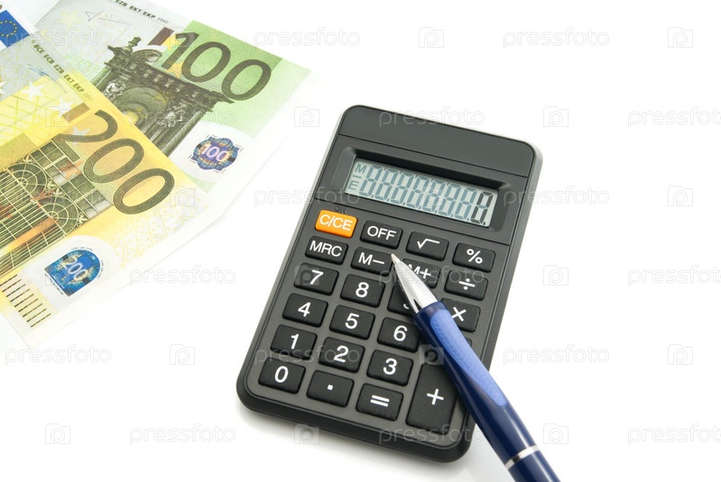 Деньги, калькулятор и синяя ручка