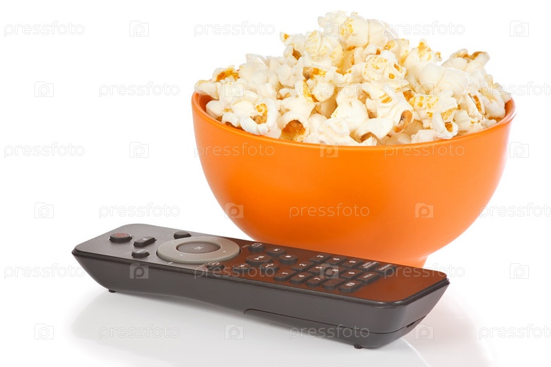 Попкорн в оранжевой чаше и пульт дистанционного управления на белом фоне