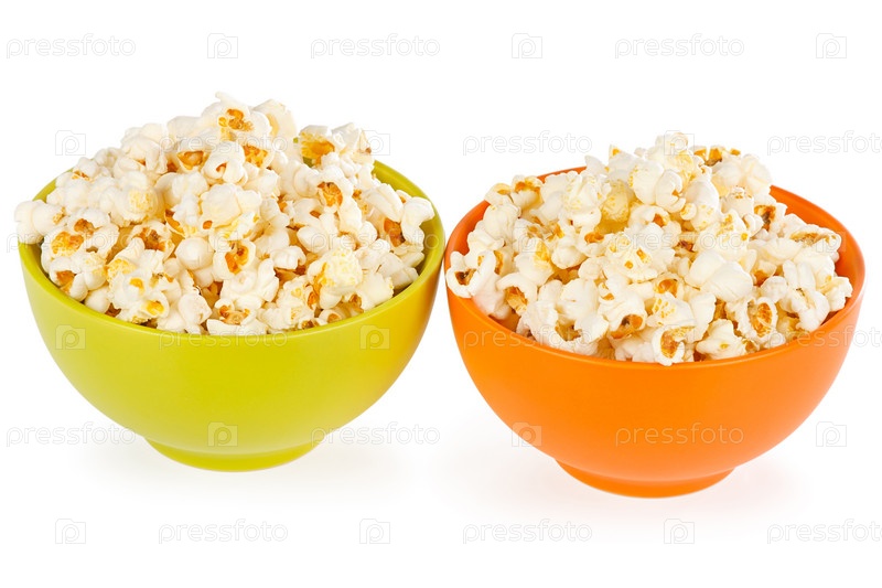 Попкорн в оранжевой и зеленой чашах на белом фоне
