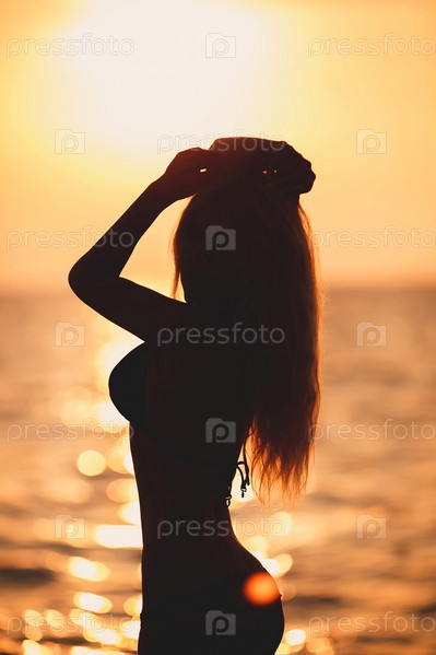 Красивая блондинка на пляже на закате