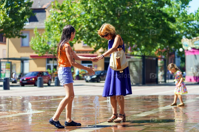 Две сестры играют в фонтане