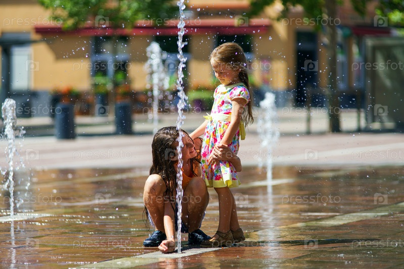 Две сестры играют в фонтане