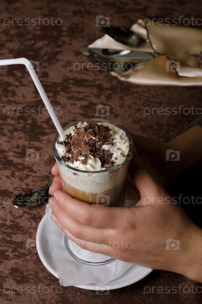 Кружка латте с шоколадом в женских руках