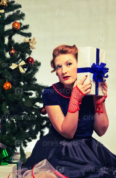 Женщина сидит возле елки с подарком в руках