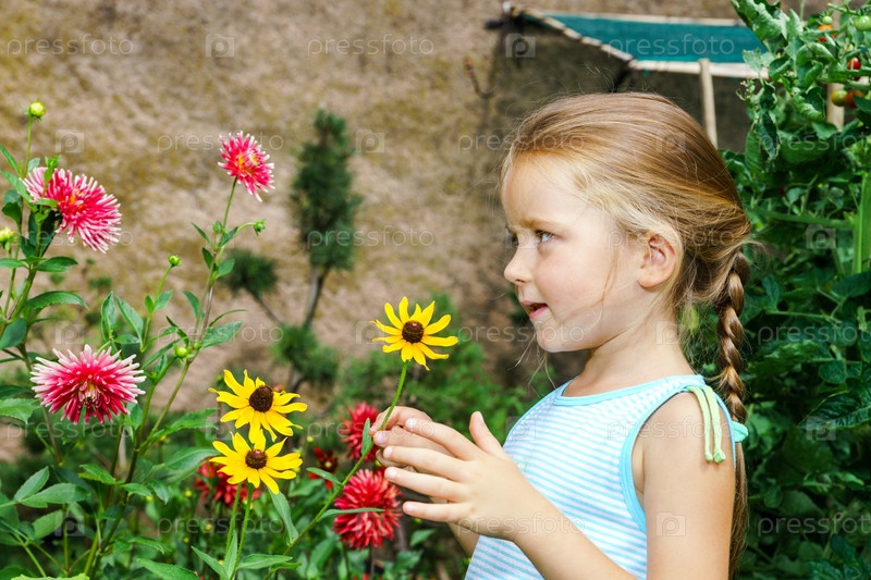Маленькая девочка на заднем дворе с живыми цветами