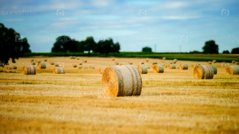 Красивые желтые поля с стога сена на закате