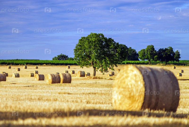 Красивые желтые поля со стогами сена