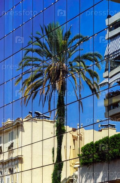 Большой пальмовое дерево отражение в стеклянной стены