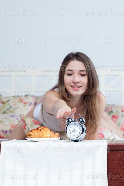 Молодая девушка в постели с часами