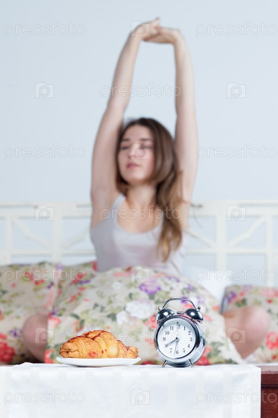 Молодая девушка в постели с часами