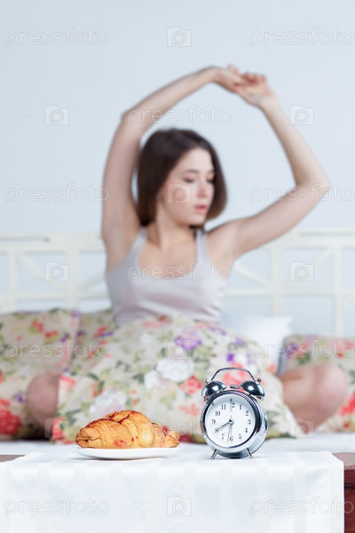 Молодая девушка в постели с часами