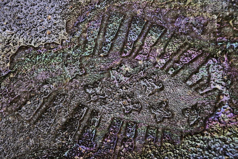 След от ботинка на талом снегу, на асфальте с бензином