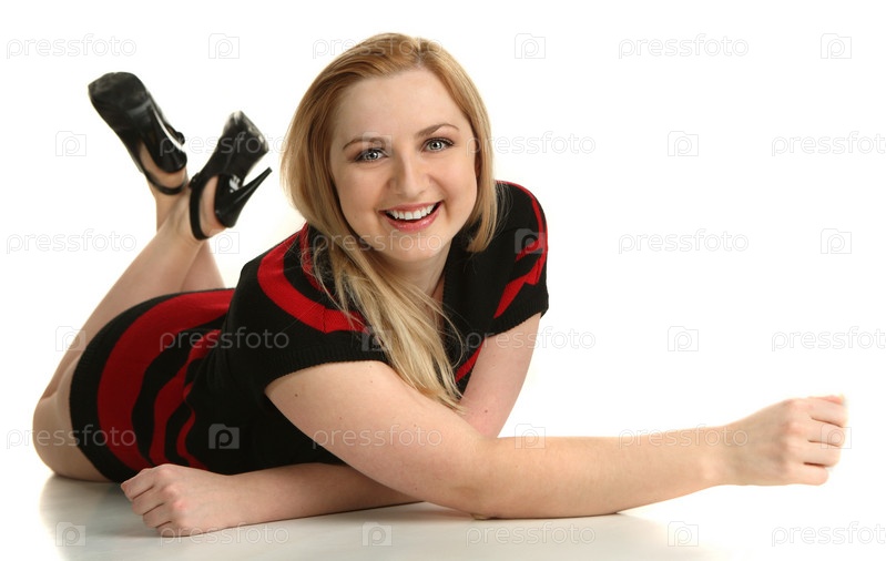 Молодая женщина позирует, лежа в студии