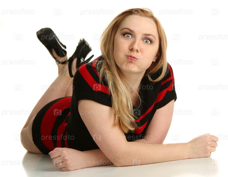 Молодая женщина позирует, лежа в студии
