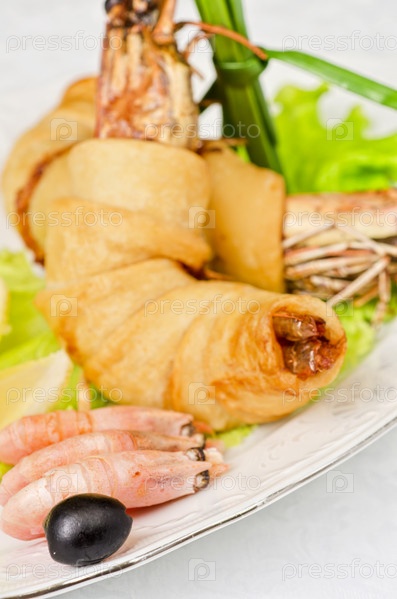 Креветки с салатом, зеленым луком, лимонами и черными оливками