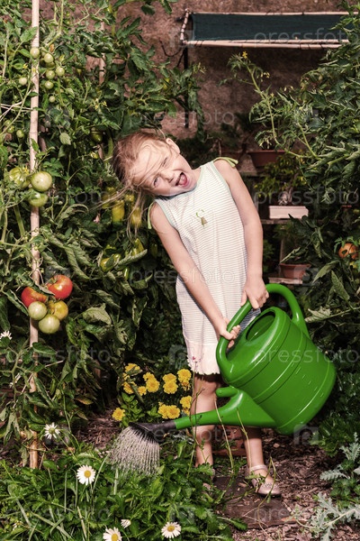 Милая маленькая девочка поливает из лейки огород