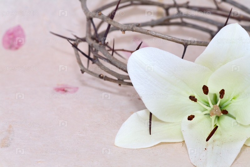 Пасхальная белая лилия и терновый венок на бежевом фоне