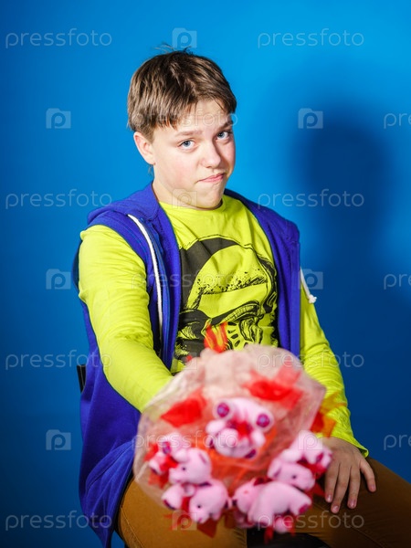 Подросток позирует с букетом плюшевых мишек