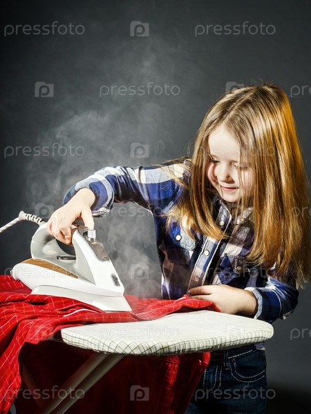 Милая маленькая девочка гладит одежду