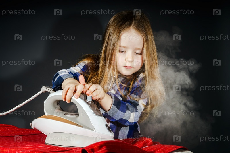 Милая маленькая девочка гладит одежду