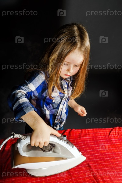 Милая маленькая девочка гладит одежду