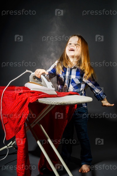 Милая маленькая девочка гладит одежду