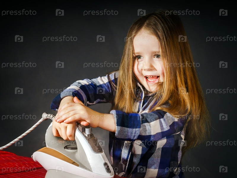 Милая маленькая девочка гладит одежду