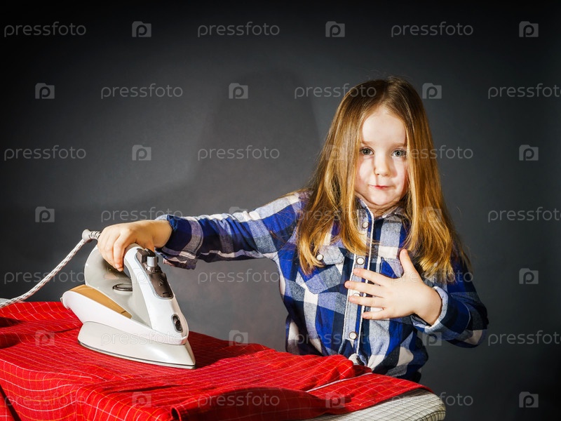 Милая маленькая девочка гладит одежду
