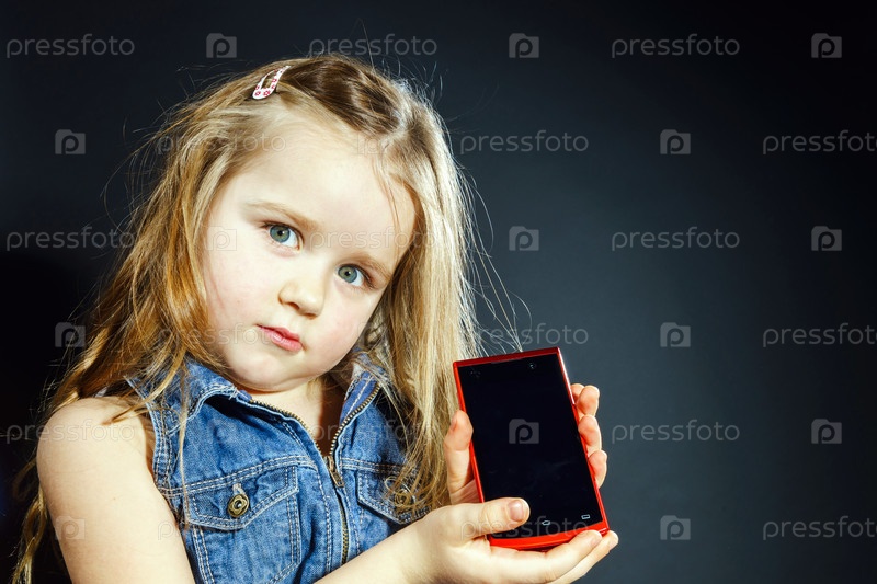 Милая маленькая девочка показывает смартфон