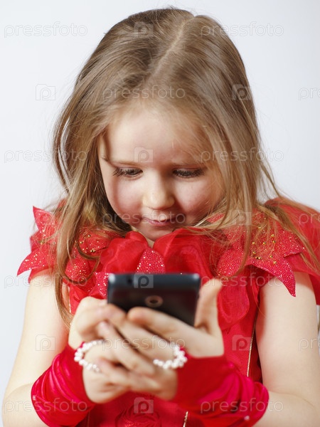 Маленькая девочка, одетый в платье, играя с смартфон