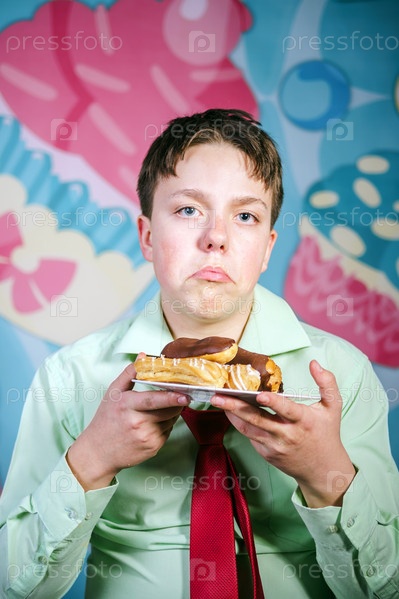 Забавный мальчик ест сладкие пирожные