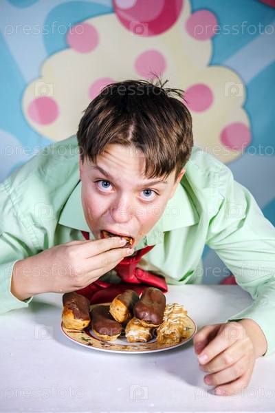 Забавный мальчик ест сладкие пирожные