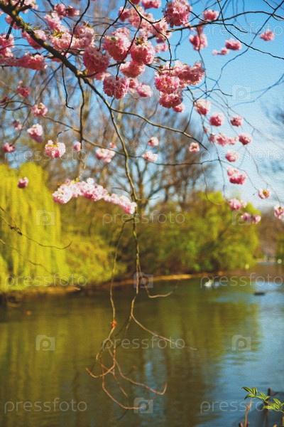 Цветущее дерево на фоне озера