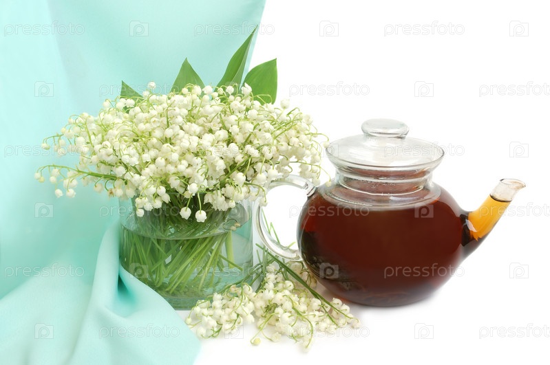 Букет лилии долины и чайник на зеленом шелковом фоне