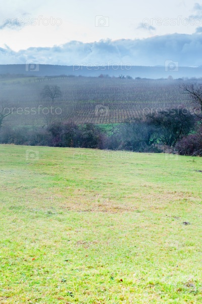Вид на виноградник на склоне Вогезами в Эльзасе на закате