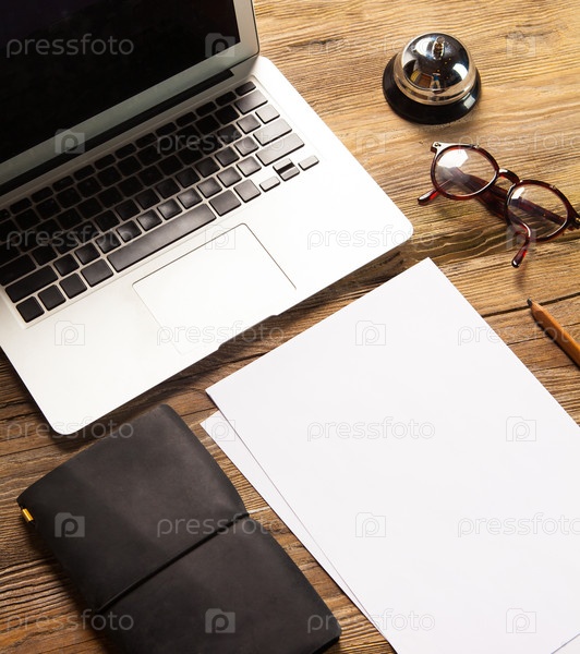 Ноутбук, бумага и очки на столе