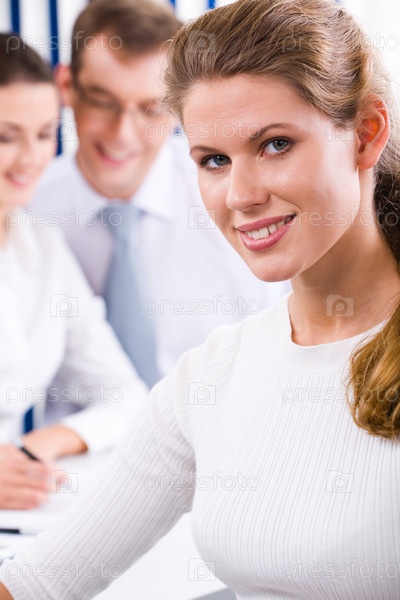 Портрет ответственной женщины с дружественной улыбкой в рабочей среде
