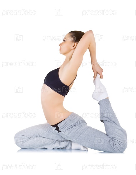 Молодая женщина занимается фитнесом, изолирована на белом фоне