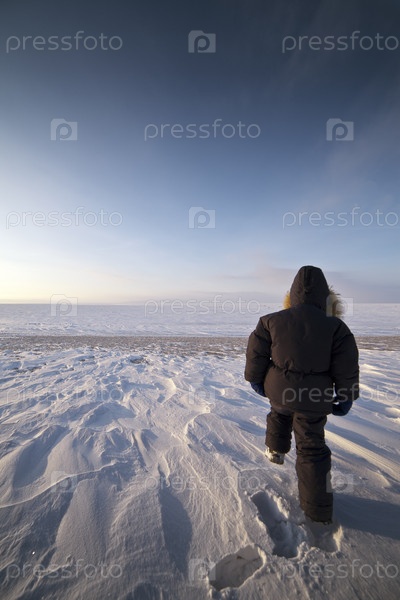 Мальчик шагает по снегу в зимний период