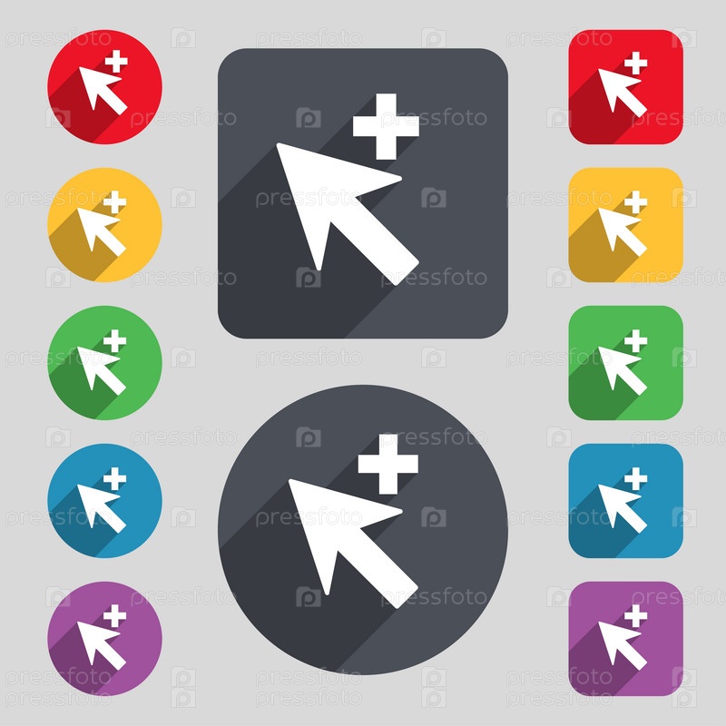 Курсор, стрелку плюс, добавьте значок знак. Набор 12 цветных кнопок и длинную тень