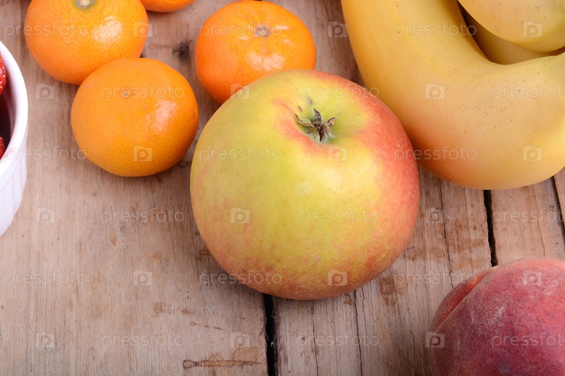 Мандарин персик бананы яблоки на деревянные пластины