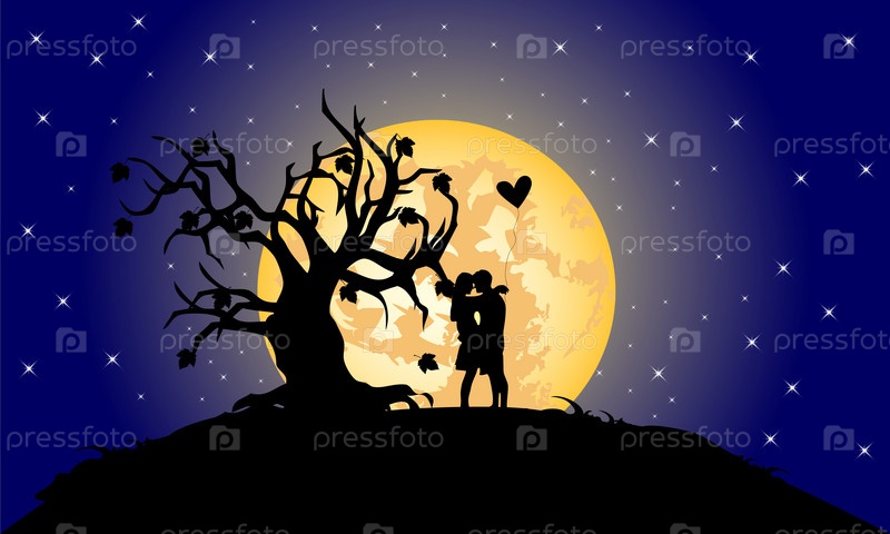 Парень с девушкой возле дерева на фоне лунной ночи