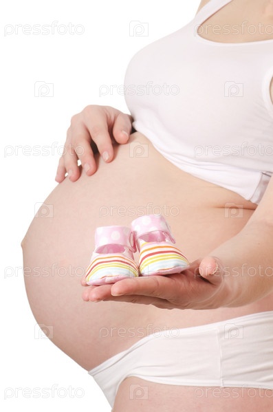Беременная женщина с пинетками в руке на белом фоне