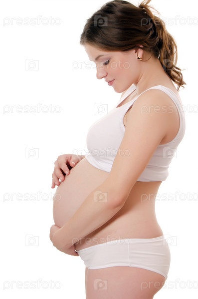Беременная женщина на белом фоне